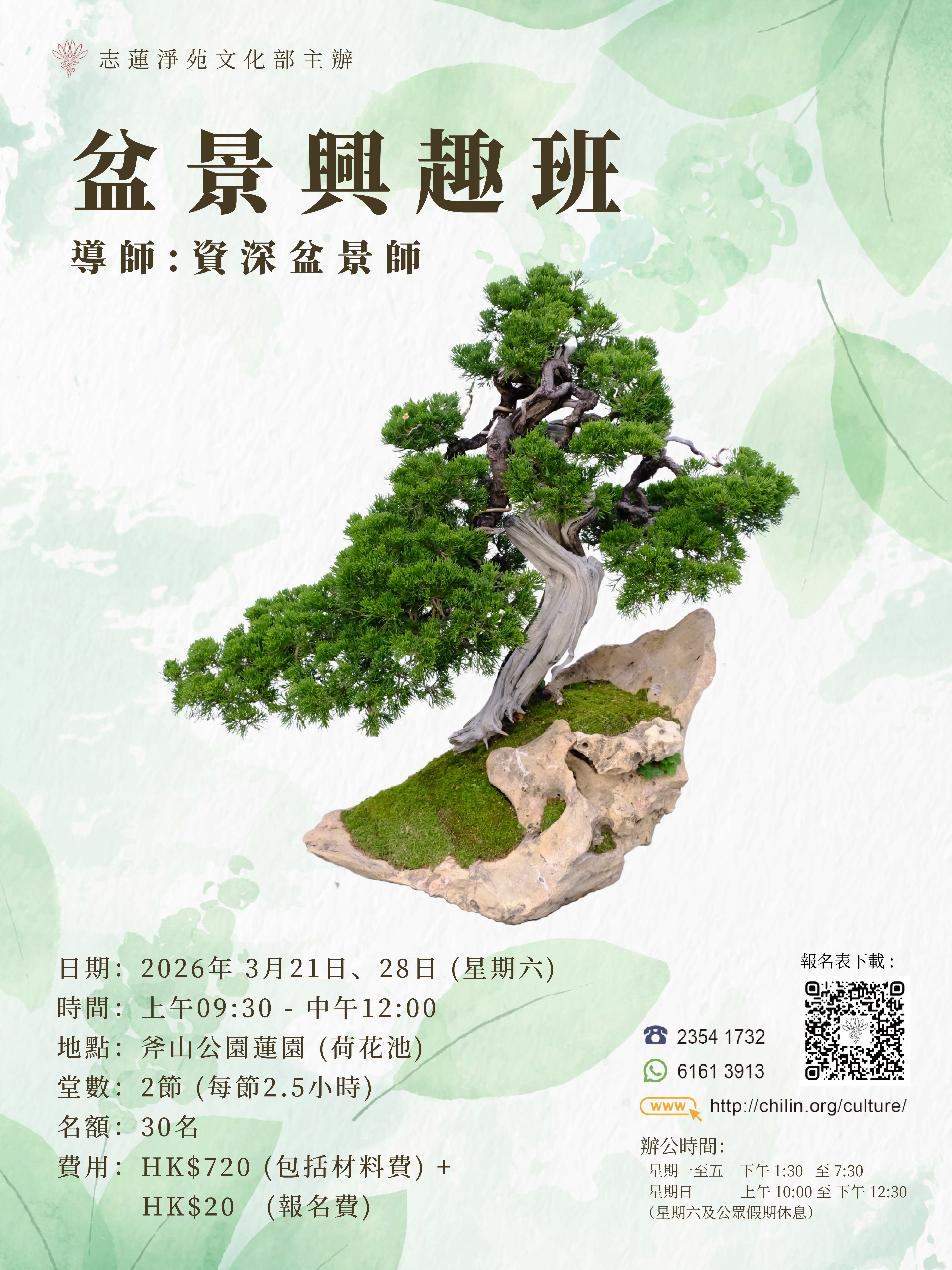 盆景興趣班 (2026.03) 本興趣班每年在春、夏、秋三季開班,由導師詳細講解盆景造型及修剪技法,學員透過實踐及日後追隨導師練習,對盆景藝術當有更深刻認識。 【上課日期:2026年3月21、28日】 導 師: 本院眾導師 導師簡介: 課程編號:C609B 開課日期:2026年03月21日 上課時間:逢星期六 上午9:30-12:00 上課地點:斧山公園蓮園 (荷花池) 堂 數:2堂 名 額:約 30人 學 費:$720(含材料費) 課程對象: 學員自備: